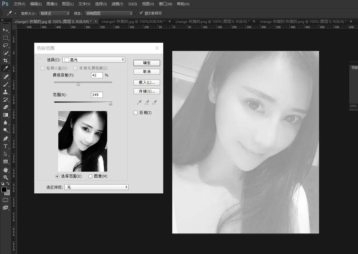 2.色彩范围处理 对于白底所要展示的图片,我们需要将高光部分去掉,我们可以对每个像素点做亮度的判断然后根据亮度来做透明度的处理就可以实现效果。