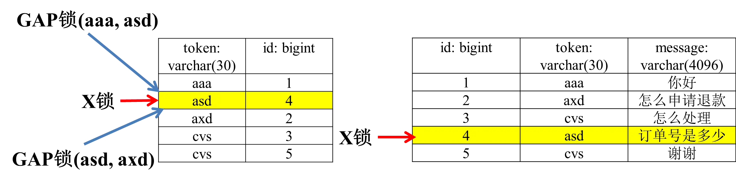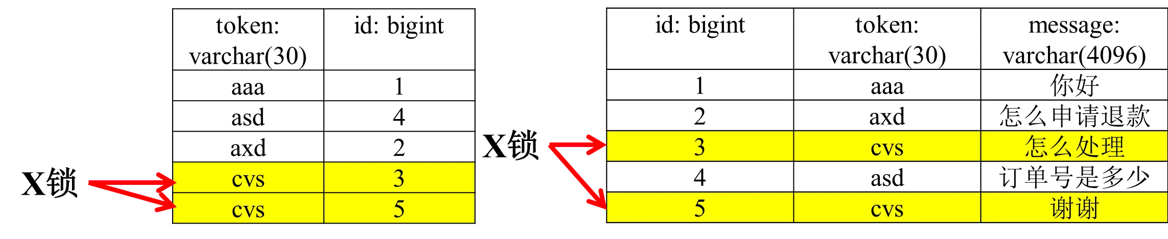 由于token是二级索引,因此首先锁住二级索引(两行),接着会锁住相应主键所对应的记录;