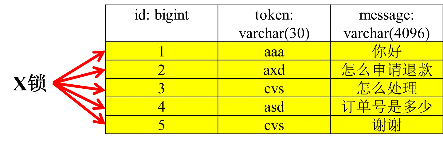 message没有索引,所以走的是全表扫描过滤。这时表上的各个记录都将添加上X锁。