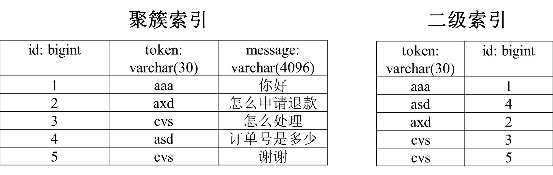 假设我们有一张消息表(msg),里面有3个字段。假设id是主键,token是非唯一索引,message没有索引。