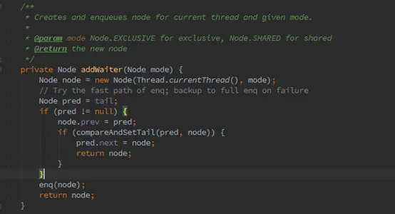 如上图所示,addWaiter方法的功能是将当前线程封装成Node,并加入到AQS链表尾部,参数mode是传入的Node.EXCLUSIVE,代表实例化的node是独占模式,而非共享模式,注意如果pred == null表示内部队列还没有初始化,则会调用enq(node)。或者pred != null 但是在compareAndSetTail失败时,也会调用enq(node)。例如,同时有多个线程node尝试加入到链表末尾,就会存在失败的可能。