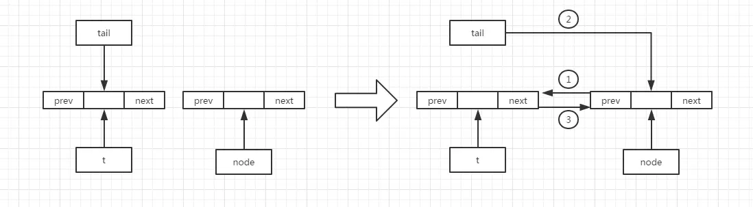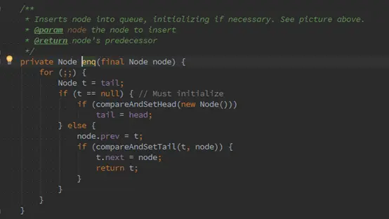 这个方法的最外层是一个大的for循环,并且是一个死循环。出口返回条件只有一个:成功加入到链表的末尾。前面讲到,在链表为空或者添加node到链表末尾失败时会进入到enq方法,这里首先判断tail是否为空,如果为空,实例化一个空的Node节点,并且tail和head都指向这个空的Node,如果不为空,将node加入到链表末尾,如下图所示: