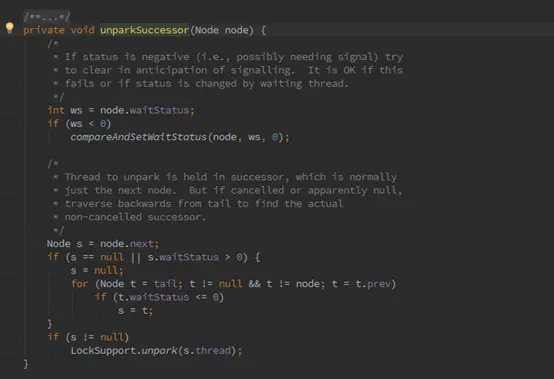 在unparkSuccessor方法中,会获取node.next,使变量s = node.next。若s不为空且状态位小于0,则满足唤醒条件,执行LockSupport.unpark()唤醒线程。否则执行for循环递归查找到离head最近的一个待唤醒节点唤醒,节点唤醒之后会继续执行获取锁的操作,上面已经做过分析,这里不做赘述。