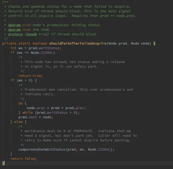 shouldParkAfterFailedAcquire方法有三个作用:1、若pred.waitStatus状态位大于0,说明这个节点已经取消了获取锁的操作,doWhile循环会递归删除掉这些放弃获取锁的节点。2、若状态位不为Node.SIGNAL,且没有取消操作,则会尝试将状态位修改为Node.SIGNAL。3、状态位是Node.SIGNAL,表明线程是否已经准备好被阻塞并等待唤醒。