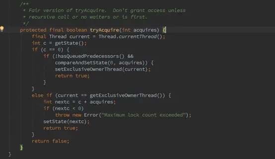 而在公平锁中,如下图所示,hasQueuedPredecessors会首先判断链表中是否有排队线程,没有排队线程才会尝试获取锁,否则加入到链表排队。严格保证了所有线程都是按照链表顺序先入先出的获取锁。