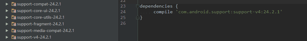 Gradle编译脚本中v4 fragment 库的依赖语句如下:compile 'com.android.support:support-fragment:24.2.1'