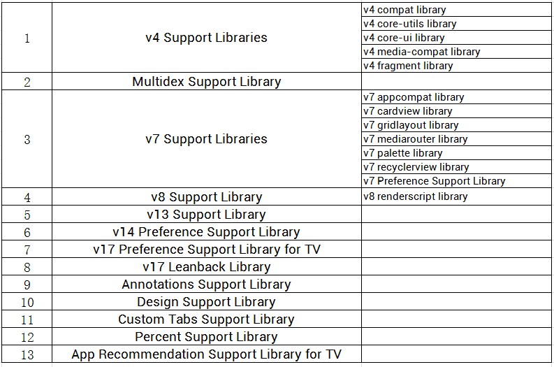 现在Android官方发布了下面13类支持库,不同的支持库包含不同特征,适用的Android版本也不相同。通常情况下我们都使用到v4和v7这两个集合库,因为这两个库支持的android系统版本范围比较广,官方推荐的UI设计模式相关类也都在这两集合库中。