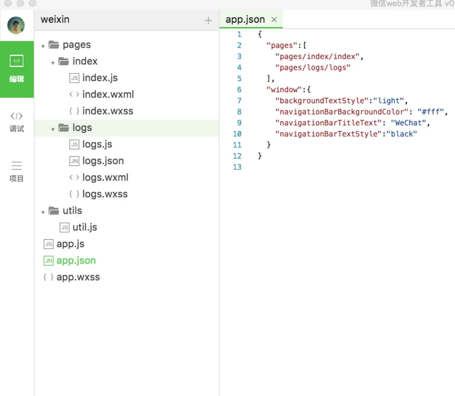 为了减少配置项,小程序中一个页面中的四个文件必须要有相同的路径和文件名,使用微信web开发者工具