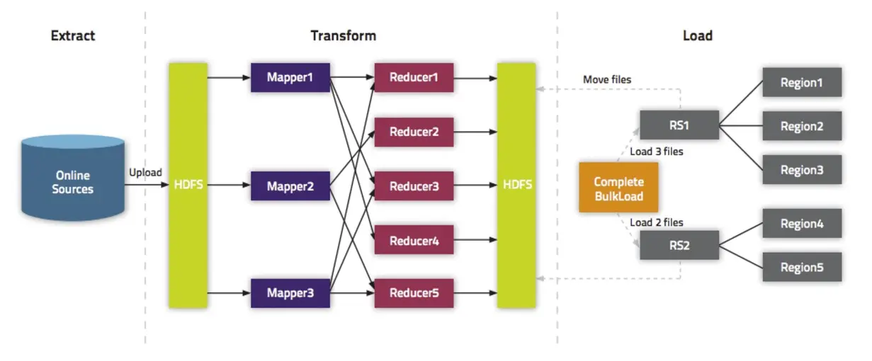 BulkLoad一共可以分为三步:数据生成,HFile转换以及HFile加载。下面这幅图(源于网络)生动地展现了各个步骤所执行的操作: