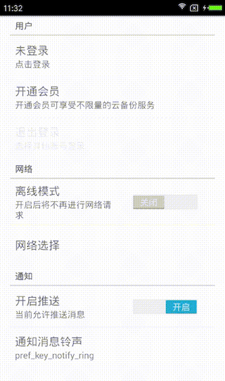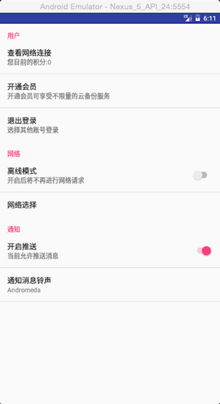 这个效果如图0-1离线模式一项,右边添加了一个SwitchButton,这个数据会以Boolean类型的形式添加进SP文件中。