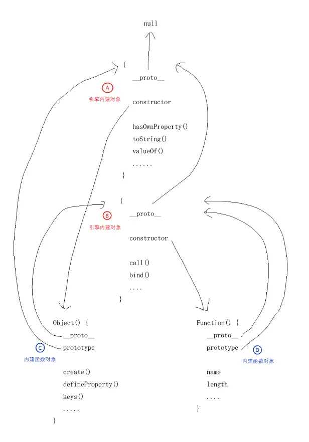 Object(即 C 对象) 函数:__proto__指向 B, 即:Object自身是一个函数对象prototype指向 A, 即: 通过new Object()创建的对象都是 ‘普通对象’