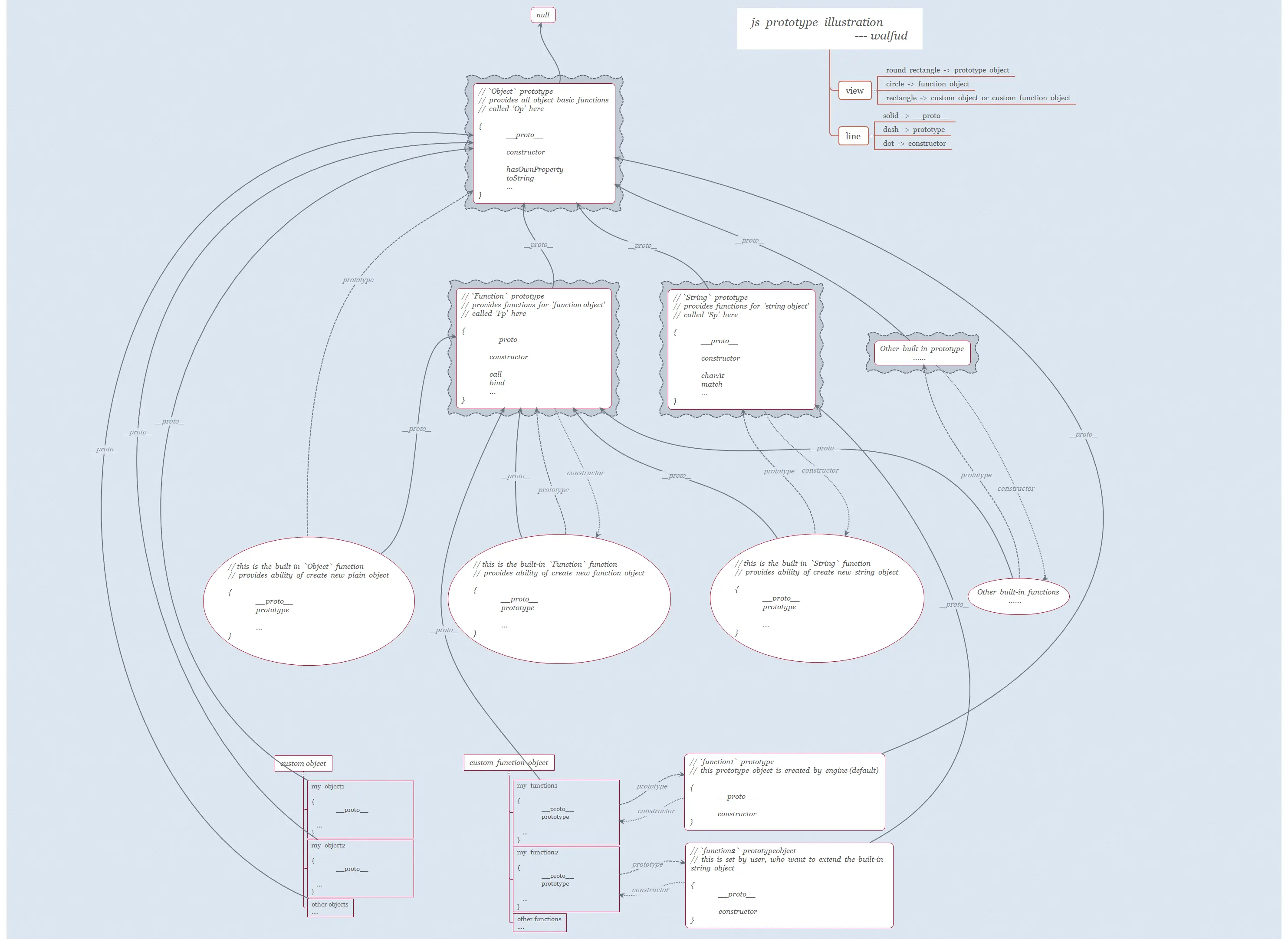最上面是 null, 下面紧接着是一切对象的原型 — Op, 其中包含了 hasOwnProperty / toString... 等 对象 所需要的方法. Op.__proto__ == null 代表着 Op 没有原型.
