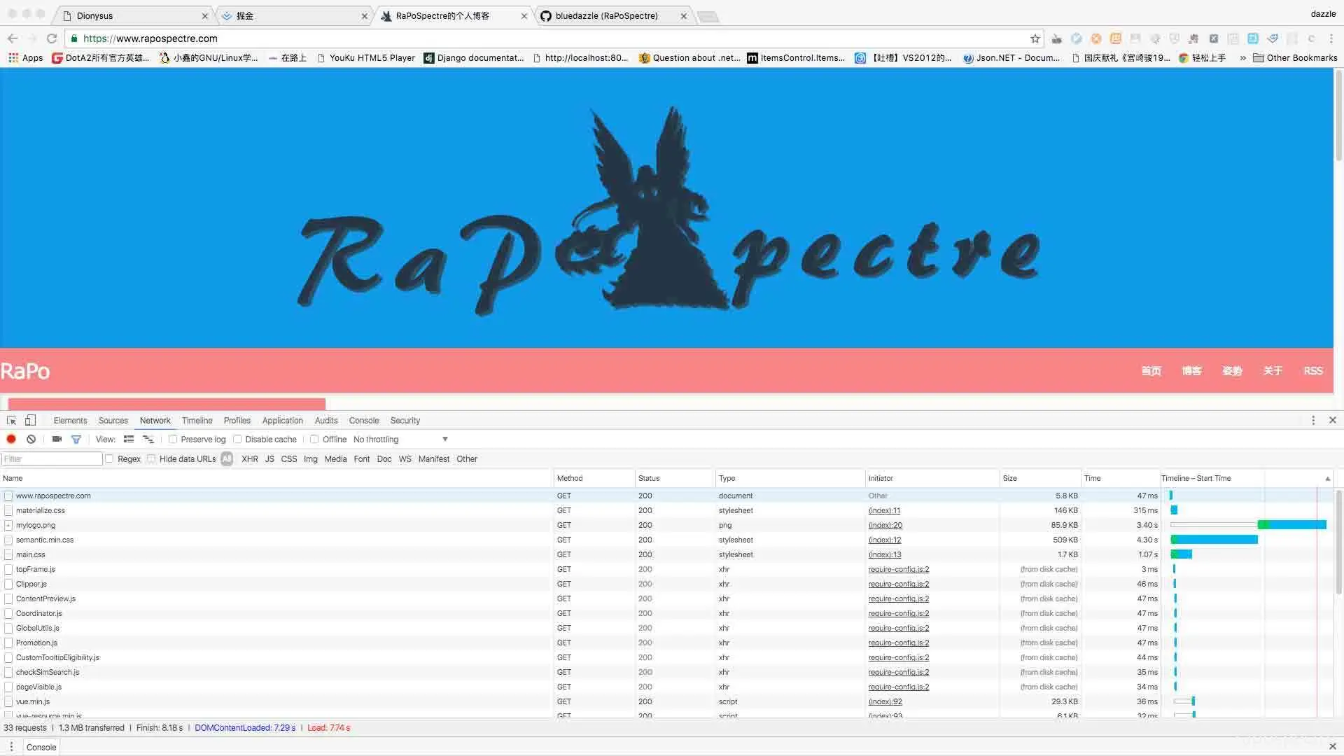 加载时间 8.18s ,一共 33 个 请求,加载 1.38MB 。 可以看到对于网速较慢的浏览者光加载资源就需要 5s 以上,再加上 33 个请求切换开销,简直不能愉快的玩耍。 所以接下来的优化手段就要从加载流量和请求数量入手: