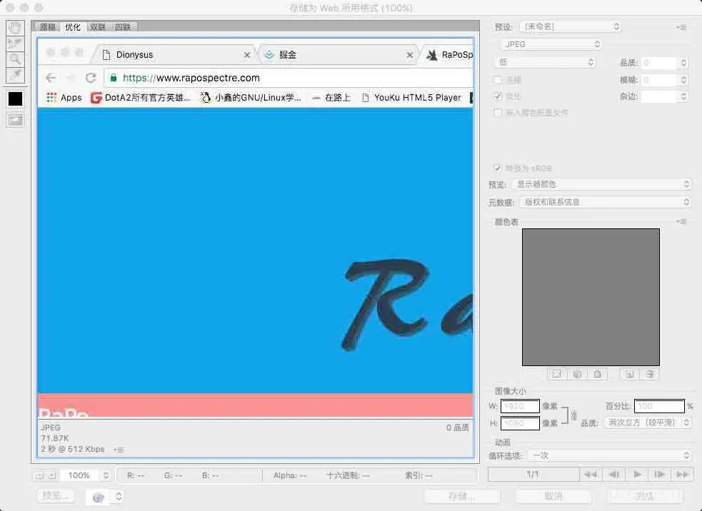 很多图片没有经过优化直接上传到网页中会占用很多额外的流量,比如一张屏幕大小的截图,用截图工具直接截图后的大小大概有 1MB ,此时直接上传到网页中就直接占用了 1MB 流量,但其实我们完全可以只牺牲它 40% 的质量换取缩小 10 倍的大小,网上有很多转化 web 图片的网站,当然如果你有 photoshop 的话完全可以自己导出: