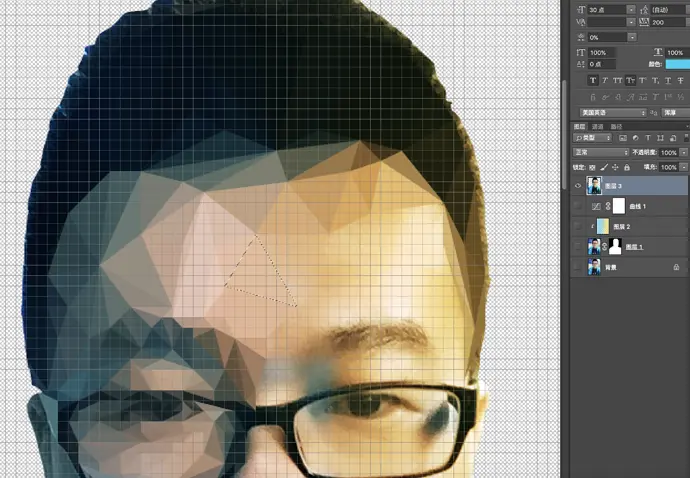 然后选中曲线和图层2和图层1(shift+option+command+e)得到图层3如下图,这样就可以开始绘画了。网格在首选项里面进行设置,用套索工具绘画三角形。当你画出第一个三角形后,去到滤镜里,找到模糊,点击平均,第一个三角形就ok了。