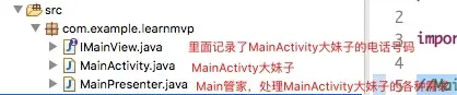 于是MVP架构就出现了,就是为了解决MainActivity大妹子的烦恼,首先我们需要定义一个接口,接口干嘛用的???(握了棵草,也不讲讲清楚,上来就接口!!!)没关系,我在代码中给你注释了,不怕你看不懂