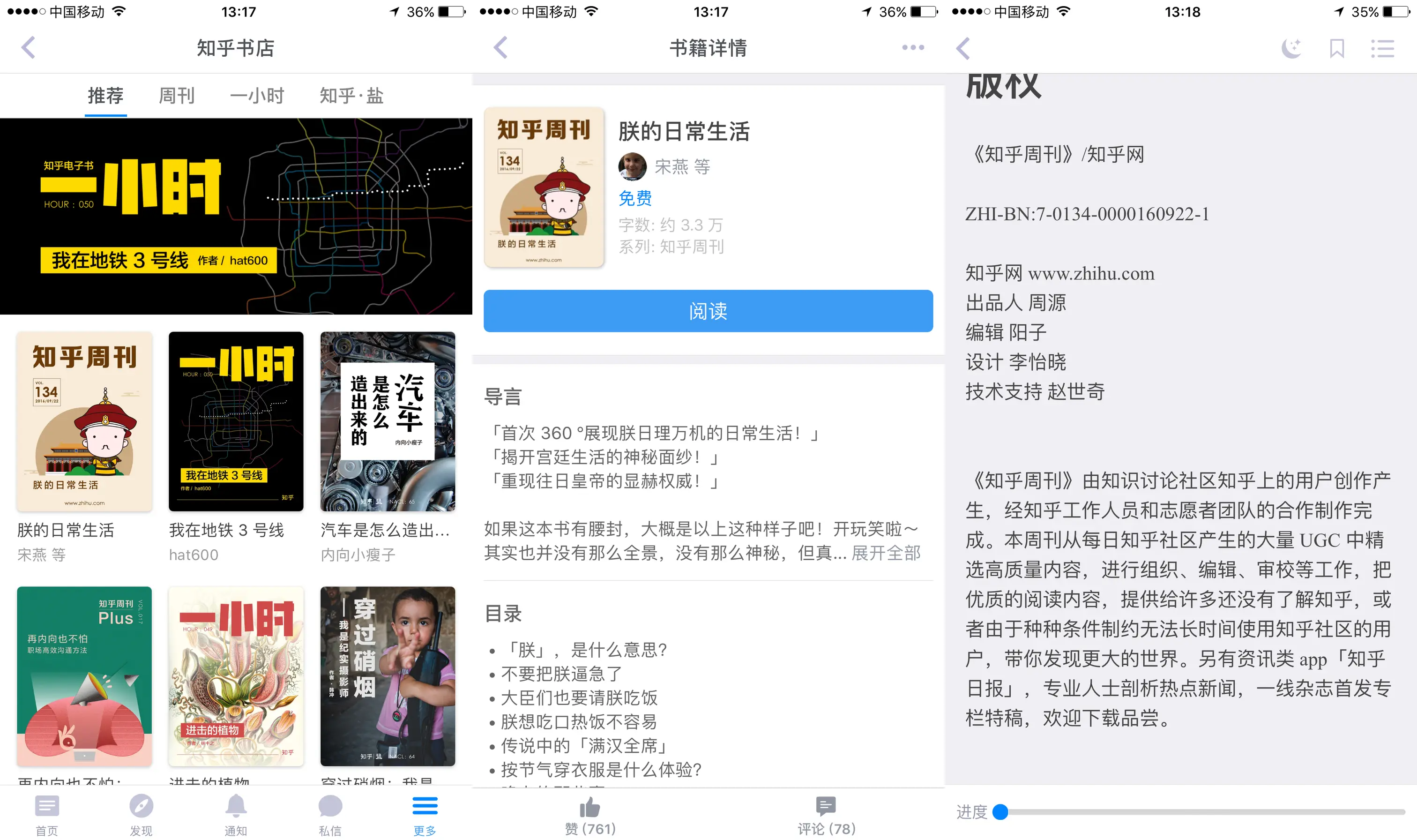 而知乎书店,前面就已经描述过,它会成为一个小而美的知乎专属电子书店。上线一周,从点赞和评论上看,是对不起知乎号称的1700万用户的。而对于读书这件事,爱好读书的人是中频,但读知乎出品的书并非刚需。 从产品形态上看,三款产品都属于低频、弹性需求的内容消费产品,对于变现而言,将是持久的过程。