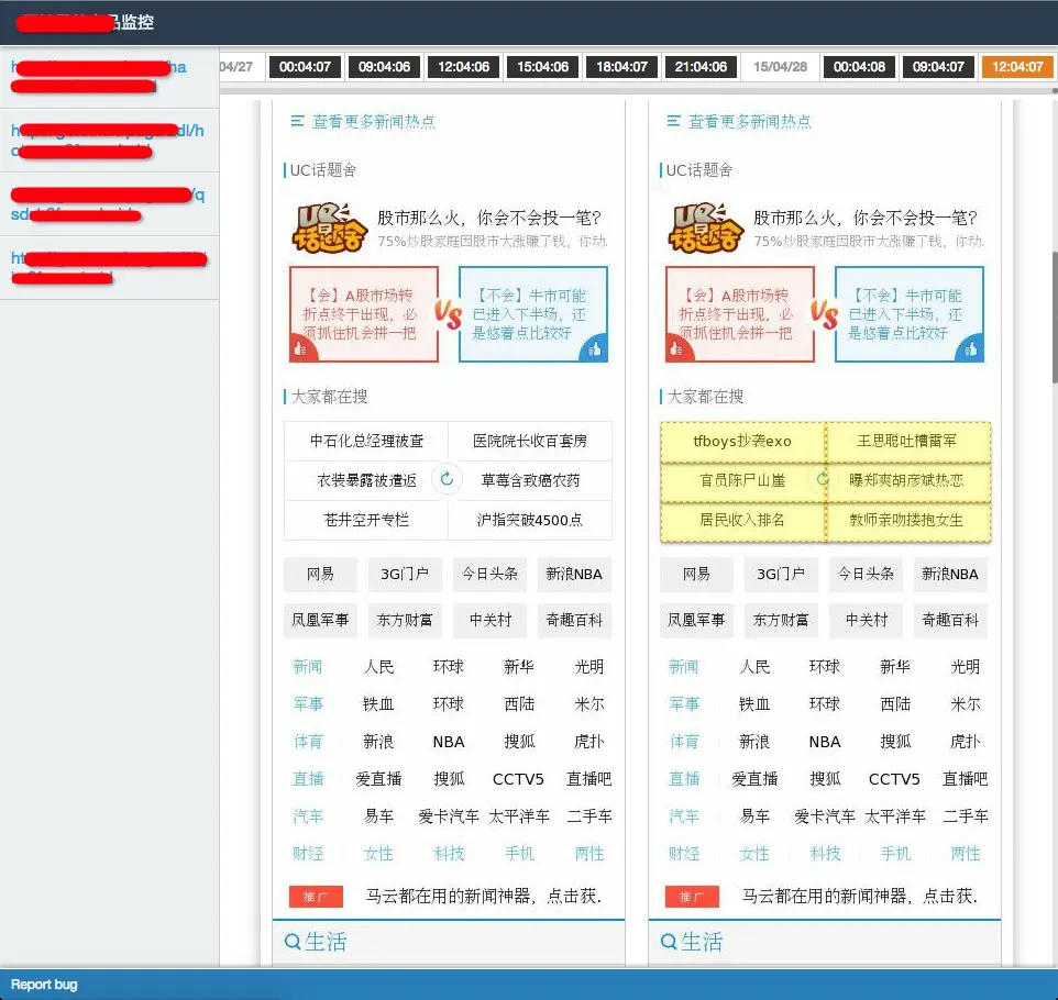 基于这样的页面差异对比监控,我们可以建立一个任务系统,把应用的所有页面url监控起来,这样每次版本迭代提交代码后,系统就能自动告诉我们,哪些页面的元素展现发生了改变,用于确定回归范围。