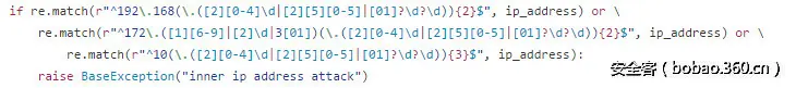 这是Sec-News最老版本判断内网IP的方法,里面使用正则判断IP是否在内网的几个段中。这个正则也是我当时临时在网上搜的,很明显这里存在多个绕过的问题: