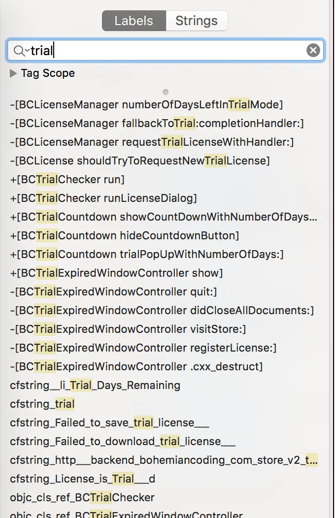 而BCTrialExpiredWindowController应该就是我们要找的弹窗的controller,有show,quit,visitStore,registerLicense等方法,嗯,没错,就是它了。这样我们就很快定位到相关函数了。