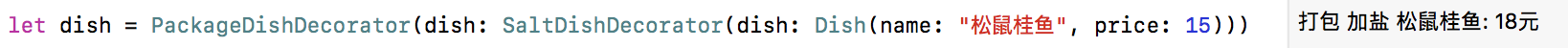 let dish = PackageDishDecorator(dish: SaltDishDecorator(dish: Dish(name: "松鼠桂鱼", price: 15)))