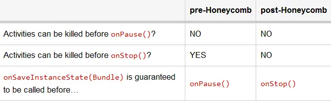这些轻微矛盾的出现是源于在Honeycomb中Activity生命周期的变化,在Honeycomb之前,actvity在调用OnPause方法之后才能被killed的,这就意味着onSaveInstanceState()需要在在OnPause之前调用。而在Honeycomb版本时,actvity只有在onStop之后才能被killed,这也就意味着onSaveInstanceState()需要在在OnStop之前调用而不是以前版本中的OnPause之前调用
