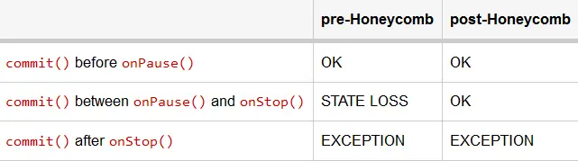 Activity生命周期的微小改变,将使得support library有时需要基于平台来改变它的一些行为,举例来说,在Honeycomb及其以上的设备中,每次在onSaveInstanceState()之后commit都会抛出这个异常,然而在Honeycomb之前的设备中异常就会出现少一些。android团队被迫做出让步:为了老版本的内在更好地兼容,老的设备不得不忍受在 onPause() and onStop()之间的状态丢失support library的行为在不同平台之间总结如下