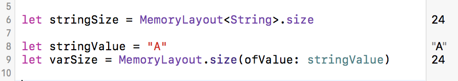 let varSize = MemoryLayout.size(ofValue: stringValue)两者都会得到正确的结果: