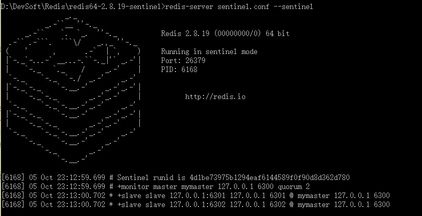 以上两种方式,都必须指定一个sentinel的配置文件sentinel.conf, 如果不指定将无法启动sentinel。sentinel默认监听26379端口,所以运行前必须确定该端口没有被别的进程占用。