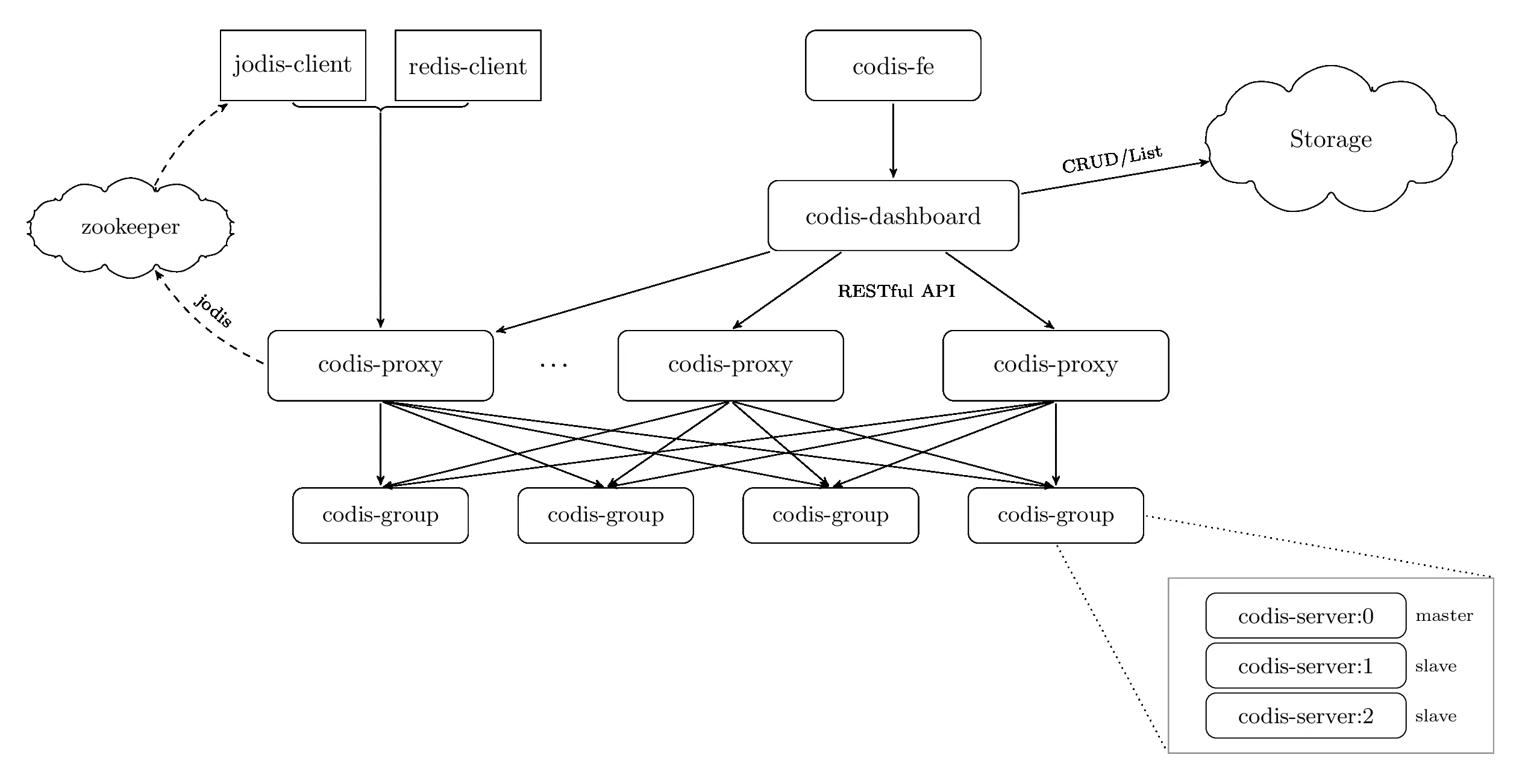 - Codis Admin:集群管理的命令行工具。可用于控制 codis-proxy、codis-dashboard 状态以及访问外部存储。