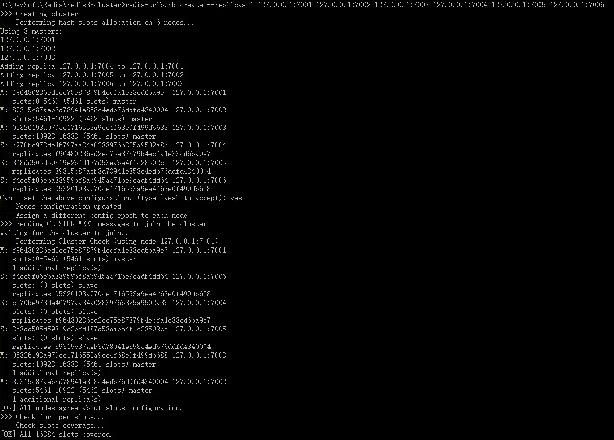 redis-trib.rb create --replicas 1 127.0.0.1:7001 127.0.0.1:7002 127.0.0.1:7003 127.0.0.1:7004 127.0.0.1:7005 127.0.0.1:7006