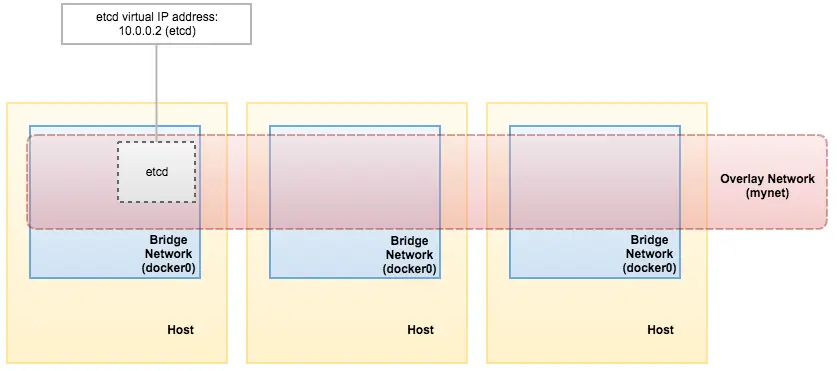 [docker1]$ docker service inspect etcd -f "{{ .Endpoint.VirtualIPs }}" [{03wvlqw41e9go8li34z2u1t4p 10.255.0.5/16} {9iy6k0gqs35bn541pr31mly59 10.0.0.2/24}]到这里,我们的架构如下图所示: