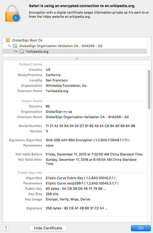 *.wikipedia.org这个证书有没被篡改,就要用到GlobalSign Organization Validation CA - SHA256 - G2提供的公钥解密前者的签名得到摘要 Digest1,我们的客户端也计算前者证书的内容得到摘要 Digest2。对比这两个摘要就能知道前者是否被篡改。后者同理,使用GlobalSign Root CA提供的公钥验证。当验证到到受信任的根证书时,就能确定*.wikipedia.org这个证书是可信的。