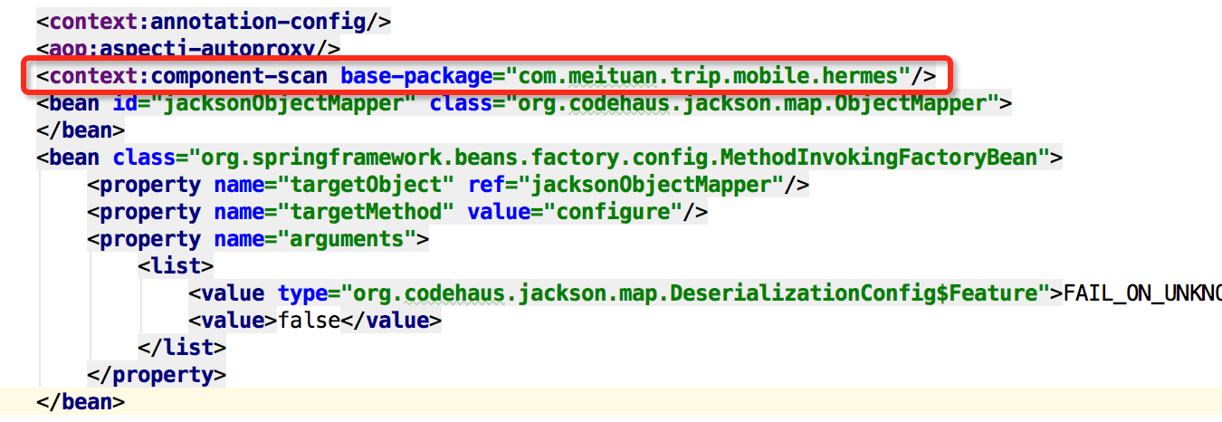 在spring/spring-servlet.xml配置文件中我们开启了注解扫描功能,并且从项目路径“com.meituan.trip.mobile.hermes”开始扫描: