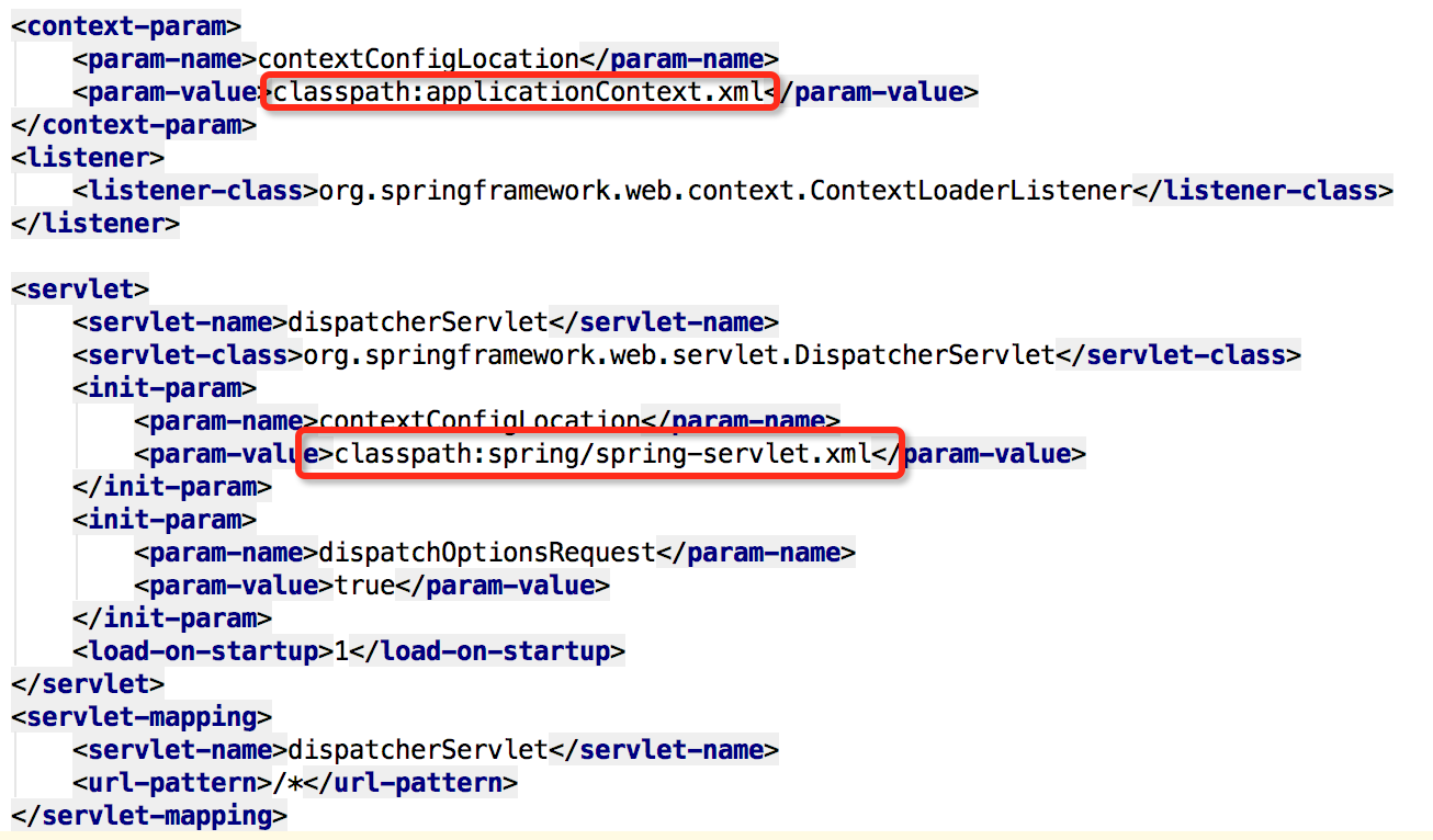 到这里我们找到了引起事故发生的根本原因,但是我们还需要找出引发事故的罪魁祸首!通过前面的分析我们知道这和ContextLoaderListener、DispatcherServlet有关系,那就定位到web.xml的配置文件中来:
