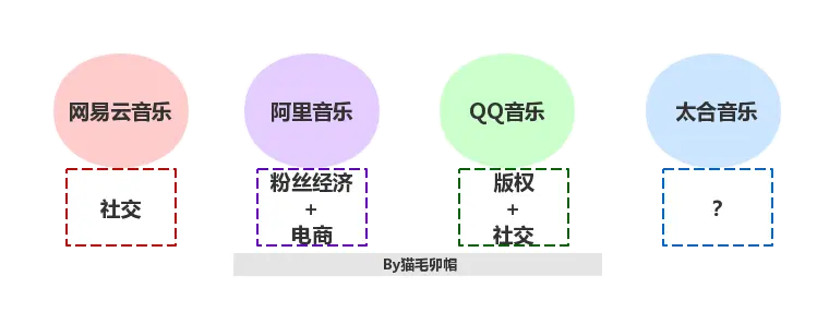 网易云音乐选择了建立社交生态,将音乐播放器定位为“情感陪伴”,依托“内容版权+社交传播+电商发售+线下活动”模式;QQ音乐似是定位于“高品质资源库”,利用已购买的版权资源强势分发,致力打造“内容版权+社交传播+电商发售+O2O演出”的数字音乐生态模式;虾米音乐保持原有定位,“有B格的独立音乐发烧友聚集地”,商业化改革相对滞后。先不论这些产品成功与否,至少他们都吸引到了相当的粉丝为其发声,愿意付费。其中,猫毛卯帽对“陪伴”这个定位最为看好,因为这几乎可以覆盖所有的潜在用户,并且较自然地延伸“音乐+社交”、“音乐+场景”,所以这将作为理想的第二突破口。