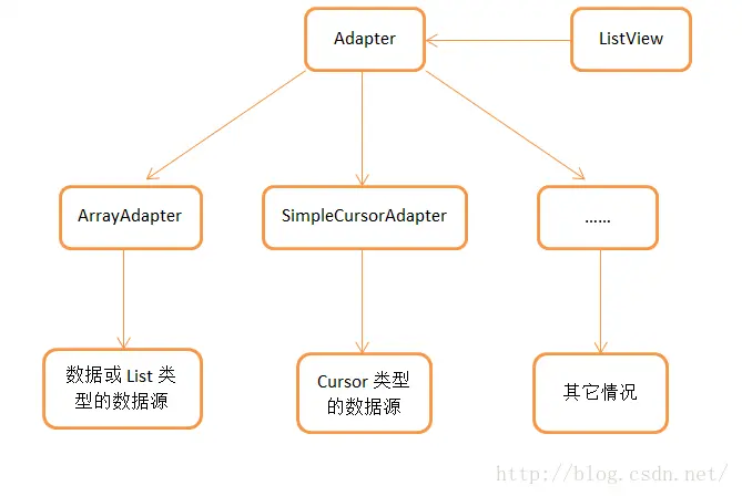 那么显然Android开发团队是不会允许这种事情发生的,于是就有了Adapter这样一个机制的出现。顾名思义,Adapter是适配器的意思,它在ListView和数据源之间起到了一个桥梁的作用,ListView并不会直接和数据源打交道,而是会借助Adapter这个桥梁来去访问真正的数据源,与之前不同的是,Adapter的接口都是统一的,因此ListView不用再去担心任何适配方面的问题。而Adapter又是一个接口(interface),它可以去实现各种各样的子类,每个子类都能通过自己的逻辑来去完成特定的功能,以及与特定数据源的适配操作,比如说ArrayAdapter可以用于数组和List类型的数据源适配,SimpleCursorAdapter可以用于游标类型的数据源适配,这样就非常巧妙地把数据源适配困难的问题解决掉了,并且还拥有相当不错的扩展性。简单的原理示意图如下所示: