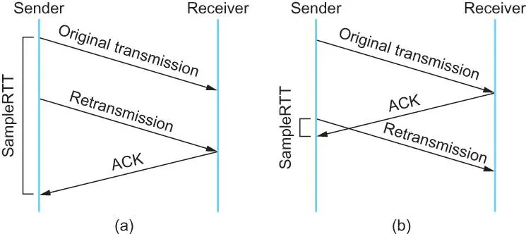 - 情况(b)是ack回来慢了,但是导致了重传,但刚重传不一会儿,之前ACK就回来了。如果你是算重传的时间和ACK回来的时间的差,就会算短了。