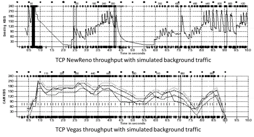 这个算法1994年被提出,它主要对TCP Reno 做了些修改。这个算法通过对RTT的非常重的监控来计算一个基准RTT。然后通过这个基准RTT来估计当前的网络实际带宽,如果实际带宽比我们的期望的带宽要小或是要多的活,那么就开始线性地减少或增加cwnd的大小。如果这个计算出来的RTT大于了Timeout后,那么,不等ack超时就直接重传。(Vegas 的核心思想是用RTT的值来影响拥塞窗口,而不是通过丢包) 这个算法的论文是《TCP Vegas: End to End Congestion Avoidance on a Global Internet》这篇论文给了Vegas和 New Reno的对比: