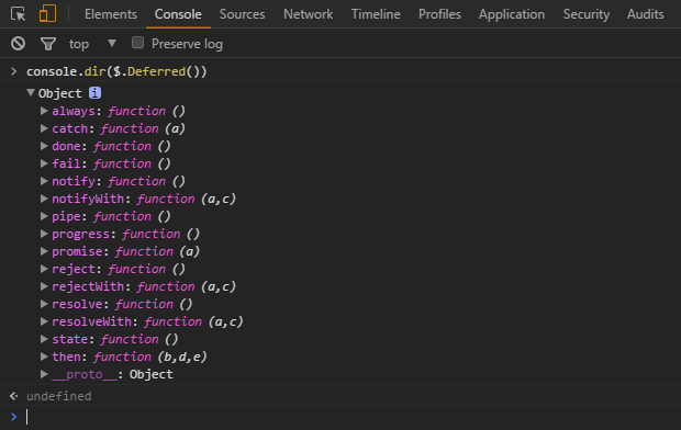 jquery用$.Deferred实现了Promise规范,$.Deferred是个什么玩意呢?还是老方法,打印出来看看,先有个直观印象: