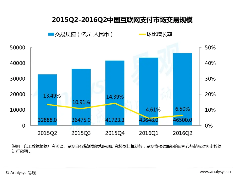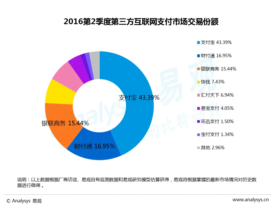 2016年Q2中国第三方支付互联网支付市场交易规模呈现季度性增长,规模达46500亿元,环比增加6.5%。互联网支付行业格局保持稳定。市场交易份额对比,支付宝、财付通、银联商务仍然占据前三位,支付宝以市占率43.39%位居榜首。