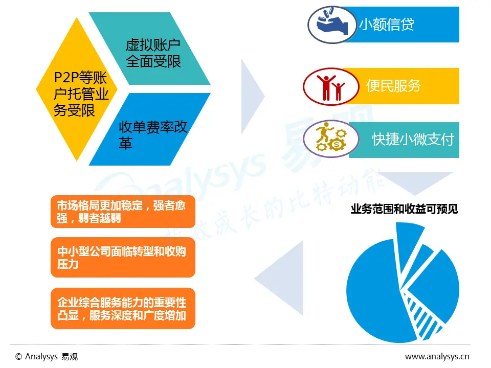 Analysys分析认为,增值服务的丰富程度将成为第三方支付公司的核心竞争力。监管条例的陆续出台将加速行业洗牌。