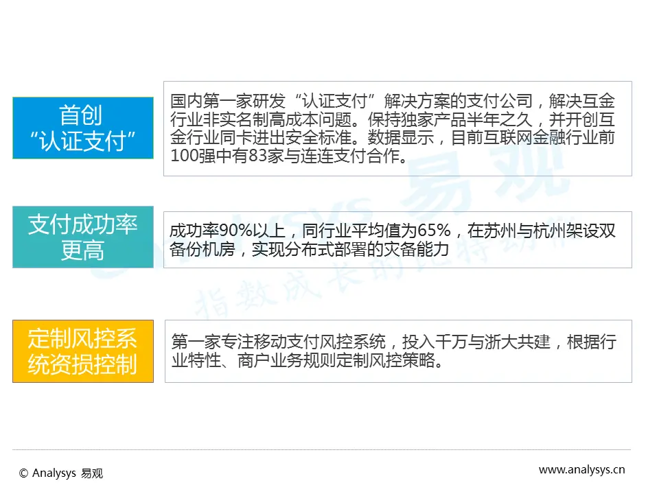 联动优势多年来为游戏、手机应用、电商等行业商户提供了多用途的话费支付服务,在此基础上,联动优势已经将业务拓展至企业综合金融支付服务,涉及资金归集、供应链管理等多个方面。根据易观统计数据,联动优势已在移动支付领域排名第四位。