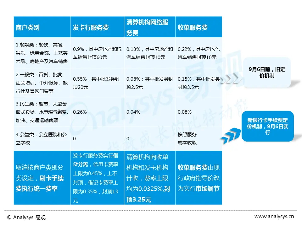 Analysys易观分析认为,统一各行业银行卡收单费率标准,并以借记卡、贷记卡作为区分收取服务费用,将有效遏制收单服务市场长期存在的商户资料造假、套码等针对银行卡刷卡手续费率的套利行为,有利于市场的长期稳健发展和降低监管成本。