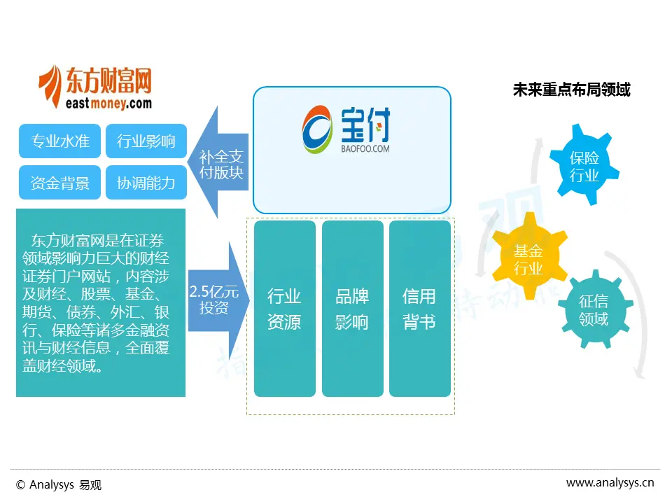 2015年7月,在证券领域影响力巨大的财经证券门户网站东方财富战略投资宝付母公司,2.5亿元获得27%股权。Analysys易观分析认为,此次投资将对宝付未来发展造成深远影响。
