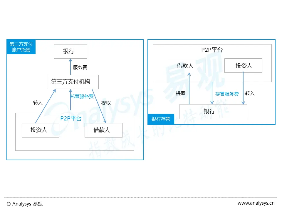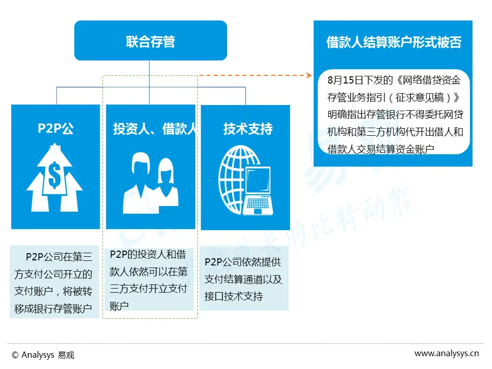 Analysys易观分析认为,《网络借贷资金存管业务指引(征求意见稿)》出台,使P2P的投资人和借款人在第三方支付开立账户变得不合规,第三方支付从账户托管中收费将受到影响;