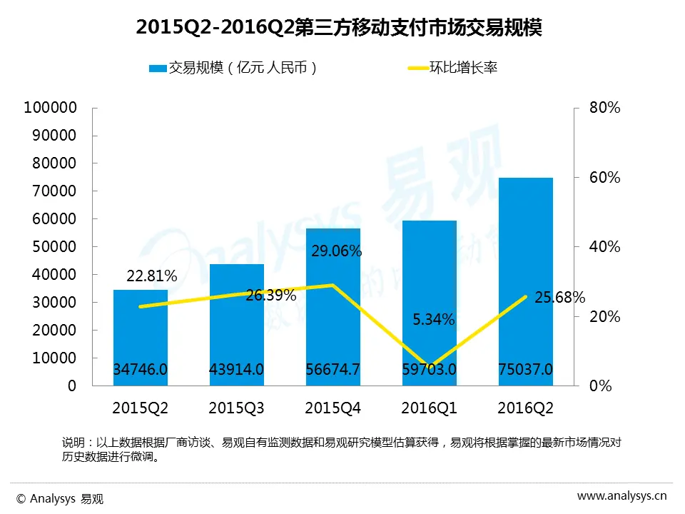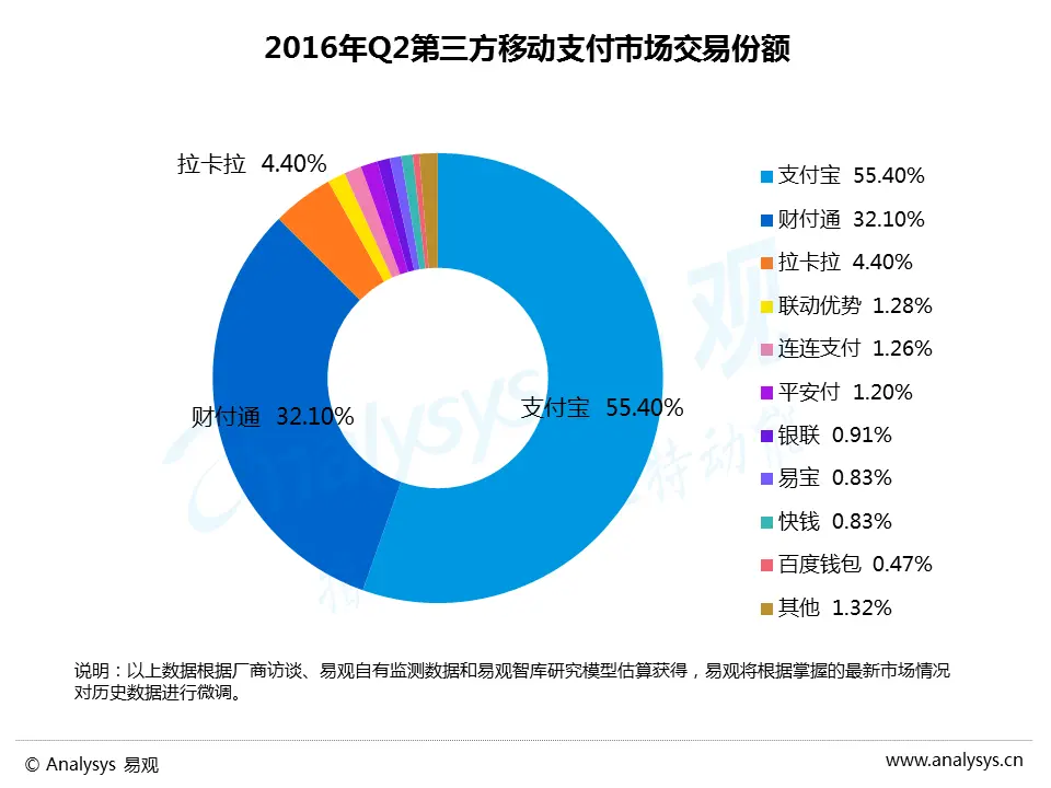 2016年第二季度,摆脱春节的影响,中国第三方支付移动支付市场增速回暖,交易规模达75037亿元,环比增长25.68%。行业上半年整体交易规模达134776亿元。支付宝、财付通、拉卡拉占据市场交易份额前三位,支付宝以市占率55.4%位列第一。