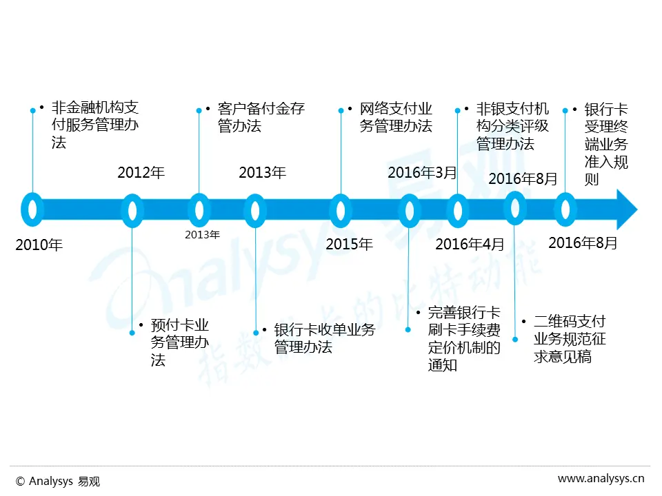2010年,非金融机构支付服务管理办法出台,第三方支付机构正式被纳入监管范围。从2015年开始,管理层监管力度逐渐加强,非银支付机构网络支付业务管理办法、完善银行卡刷卡手续费定价机制、二维码支付业务规范征求意见稿等政策相继出台。