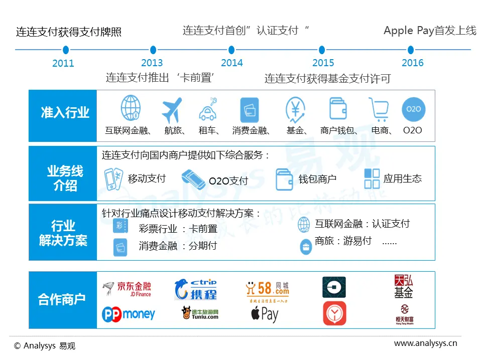 连连银通电子支付有限公司(以下简称“连连支付”)是成立于2013年,可提供线上和线下,国内和国际支付服务,专注移动支付行业解决方案。易观智库统计数据显示,连连支付在2016年第二季度中国第三方移动支付市场交易份额中排名第五位,占1.26%市场份额。