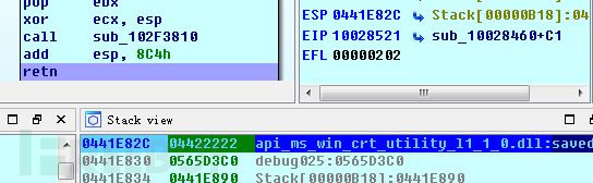 2,通过上一步找到的合适位置,覆盖0441E8C4的内容,使其指向栈上保存函数返回地址的地址。